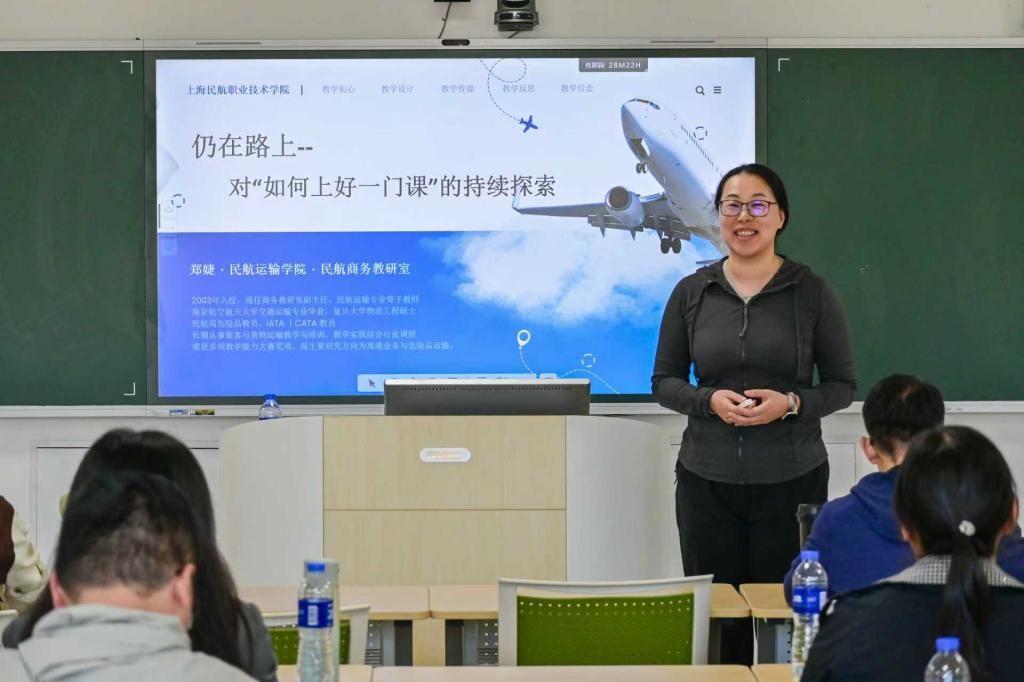 随后,民航运输学院民航商务教研室副主任、民航运输专业骨干教师郑婕副教授结合自身从教二十余年的丰富经验,以“仍在路上”为主题,从教学初心、教学设计、教学资源、教学反思与教学信念五个维度,系统梳理了自己作为一线专任教师的成长路径,分享了从“如何教”到“如何让学生学”的教学理念转变过程,强调了善用巧用以及持续更新教学资源资料的重要性,还结合近年参与市级教学能力大赛的经历,介绍了“比赛课堂”与“真实课堂”之间的差异与融合,鼓励青年教师既要精进教学技能,也要关注学生的真实学习状态与情感需求。