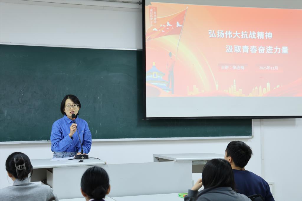 随后,马克思主义学院张连梅老师为全体学员讲授了题为“铭记历史回声,担当时代使命”的党课。张连梅凭借丰富翔实的史料,带领同学们重温那段烽火连天的岁月,深刻解读抗战精神的时代内涵。从1945年抗日战争胜利时“活着就是胜利” 的艰难坚守,到2025年新时代“复兴才是答案”的使命召唤,她以跨越八十载的历史对话,清晰勾勒出中华民族从苦难走向辉煌的奋斗轨迹。张连梅动情地表示,抗战精神不仅是镌刻在历史丰碑上的精神财富,更是指引当代青年前行的力量源泉。她勉励同学们要以史为鉴、开创未来,将对历史的敬畏转化为埋头苦干的行动自觉,把对民族的热爱融入勇毅前行的征程中,在新时代的广阔天地间书写属于青年一代的使命答卷。