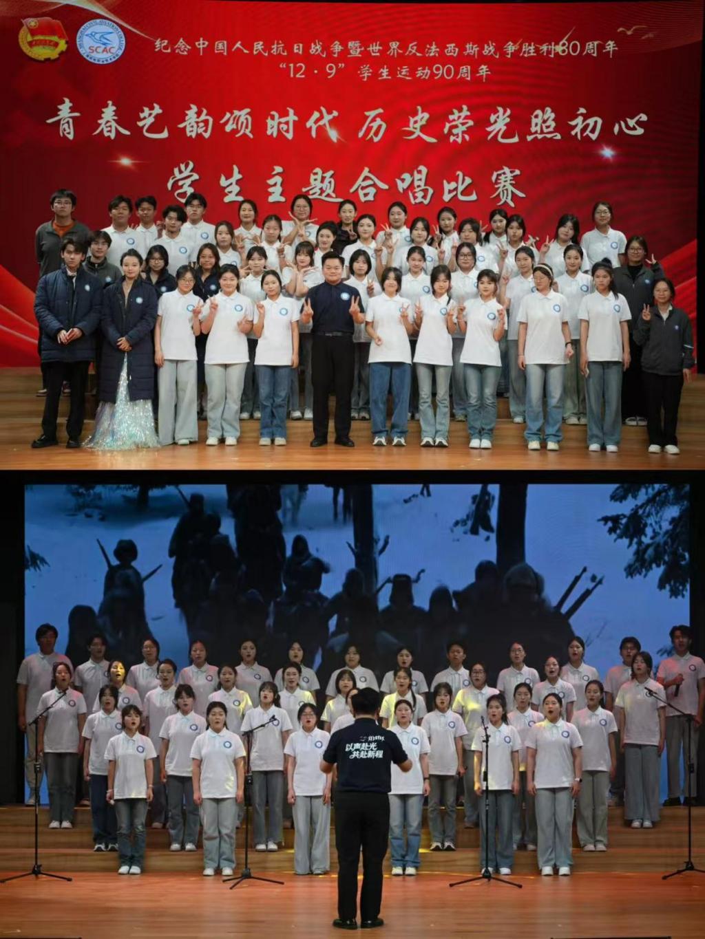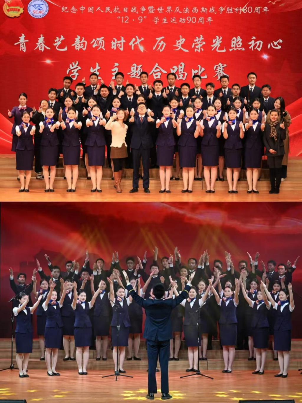 此次活动不仅是一场音乐的盛宴,更是一次精神的共振,民航人共同完成了一次对民族根脉的追寻、对集体身份的确认以及对未来使命的思考。 纪念中国人民抗日战争暨世界反法西斯战争胜利80周年,我们铭记的,是历史的悲壮与荣光;纪念“12·9”学生运动90周年,我们肩负的,是时代的使命与担当。愿民航学子永葆这份初心,在未来的蓝天上,书写无愧于时代、无愧于祖国的壮丽篇章!